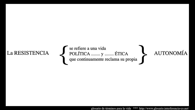 retornar al menú de glosario de términos {... para la vida ...} resistencia Se refiere a una vida política y ética, que reclama continuamente su propia autonomía. *No se trata de pensar el glosario como un esencialismo de palabras especializadas, “antigua lucha amarrada a un obsoleto lenguaje esencialista” (Sholette:2010,118), en el arte, el discurso se ha situado siempre desde una única verdad desde la individualidad del autor; por el contrario, aquí se da la voz a los contextos sociales, para que desde sus prácticas se definan las formas de operar, los intereses que están en juego, y las maneras de interacción y participación con otros y otras y el contexto y las circunstancias que mueven a estas colectividades a actuar.